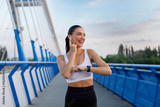 Fit lady in sportswear preparing for workout, female jogger listening music during training outdoors, standing on city footbridge