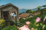 A blonde in white and brunette in blue dresses snap a selfie on a picturesque bridge in the hotel garden