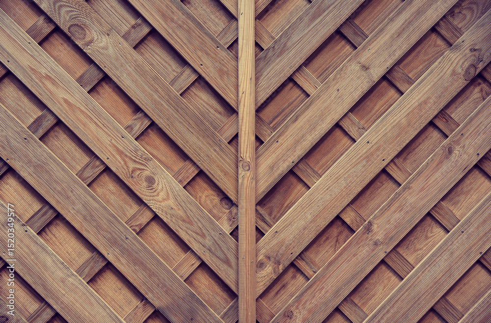 Divided background of wooden garden lattice structure with intricate craftsmanship and organic texture. Natural brown wood screen. Rustic but elegant aesthetic. Symmetrical interwoven wood slats fence