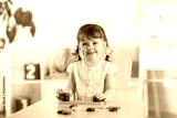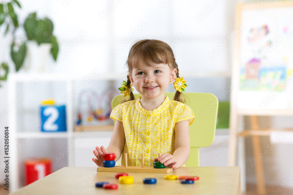 Kid girl playing with logical toy on desk in nursery room or kindergarten. Child arranging and sorting colors and sizes