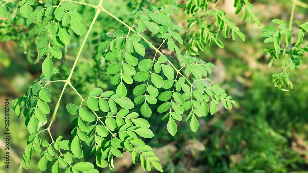 Moringa or merunggai (Moringa oleifera) in blurred background. This plant is known by other names such as: limaran, moringa, ben-oil, drumstick, horseradish tree, and malunggay in the Philippines.
