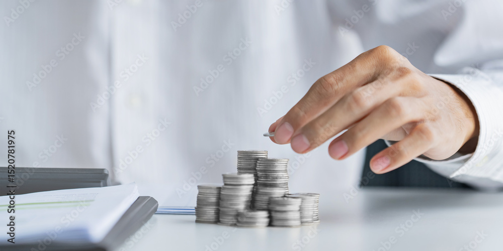 Woman with coin stack. Financial Growing savings concept. Saving money by hand putting coins money accounting planning