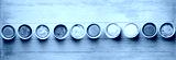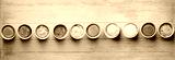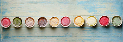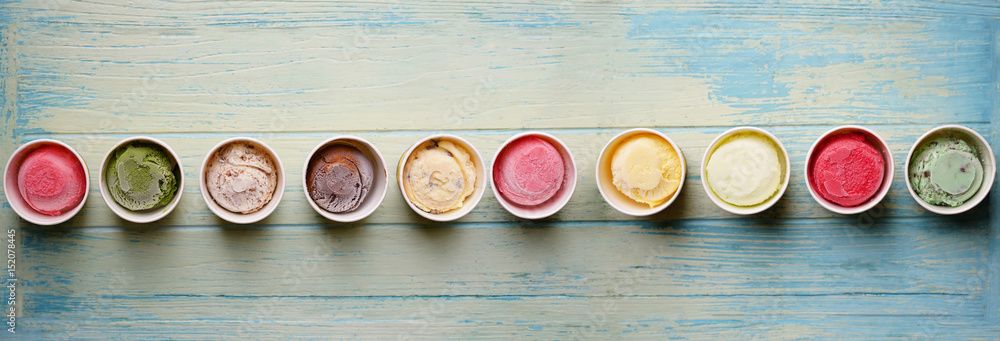 Row of assorted flavors and colors of gourmet Italian ice cream on wood table, panorama