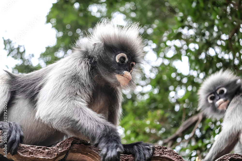 Close-up of a spectacled langur on a temple roof with another langur nearby