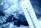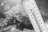 Thermometer and map of Europe in reddish colors symbolize climate change and a heat wave