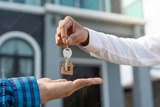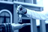 lease, rental and selling home. Real estate agent manager smile holding key for new owner. rent house, Sales, loan credit financial, insurance, Seller, dealer, installment, buy, sell, move in