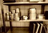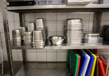 Stacked stainless steel containers and mixing bowls on a clean metal shelf in a commercial kitchen. Below, organized color-coded cutting boards for safe food preparation.