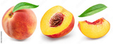 Set of red peach, juicy peach slices isolated on white background. File contains clipping paths.