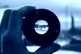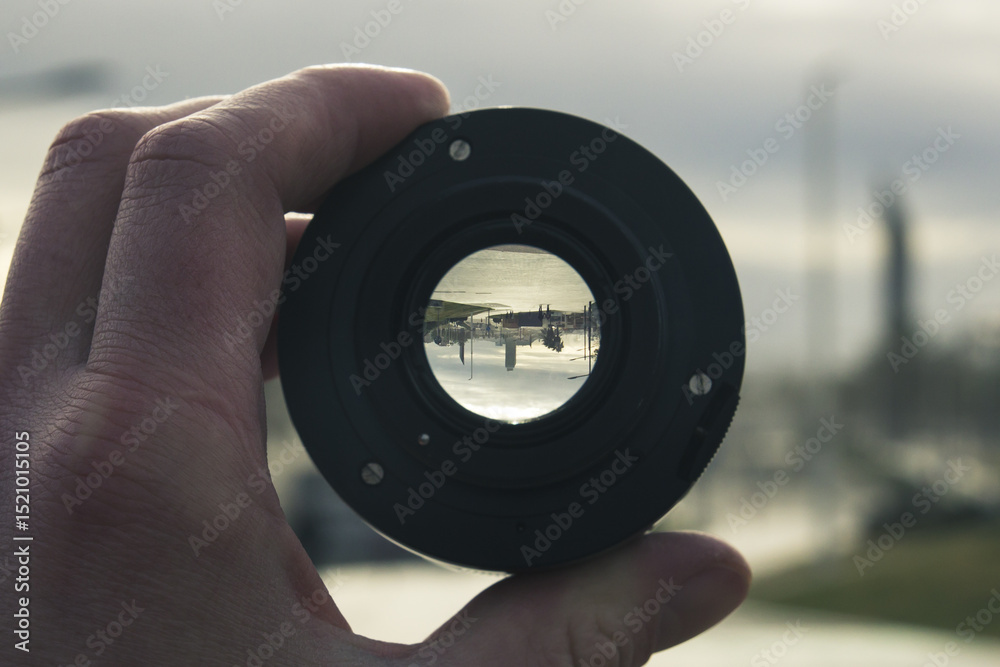 sandy beach with walking people and houses in the background, view through the lens, image inside is inverted