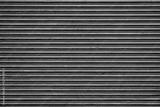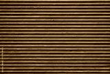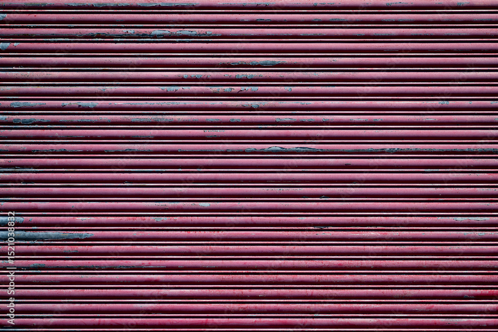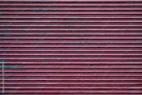 Old magenta-coloured roller shutter made of galvanized sheet metal slats. Paint is peeling off due to weathering. Vintage background on a building. Graphic line structure made of parallel elements