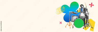 Man playing drums in suit with green bass and blue cymbals on background with colorful abstract flower shapes. Surreal design. Banner. Concept of music, concert, sound, classic and modern fusion