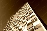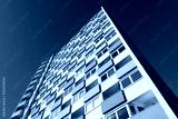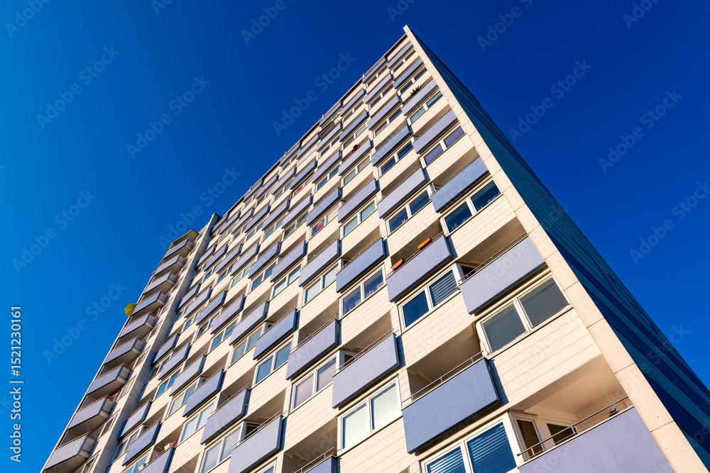 Large facade with windows and concrete balcony parapets on a sunny day with blue sky. Wide-angle shot from a frog's-eye view of a large block of flats or apartment building from the 1960s in Germany.