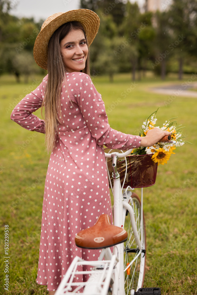 A cheerful woman wearing a polka dot dress and straw hat poses with her bicycle outdoors, surrounded by greenery and sunlight, evoking a feeling of joy, relaxation, and connection with nature.