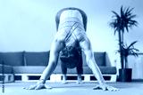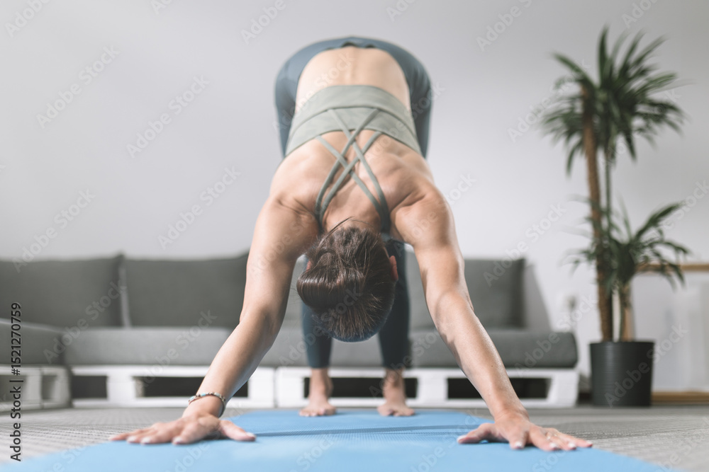 Woman practicing downward-facing dog yoga pose in modern living room setting