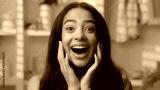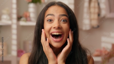 Happy shocked excited surprised woman Hispanic latina girl amazed female wonder shock good news wow holding face open mouth wow shock emotion astonishment stunned emotional in pink candy bathroom home