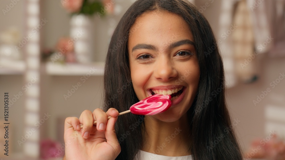Smiling Latina woman ethnic cheerful happy Hispanic female teen pampering attractive girl bite candy eating sweets diet healthcare smile toothy dental oral care beauty cosmetics ads in pink bathroom