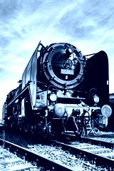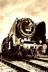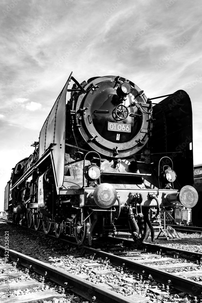 Steam locomotive of the legendary class 01 on a sunny day. Lovingly restored historic engine from a frog's-eye view. German railroad technology. Black and white vintage technology.