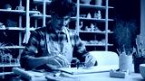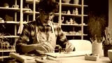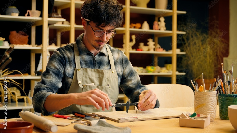 Caucasian man guy male sculptor potter art designer architect decorator craftsman holding measuring instrument working on table pottery workshop ceramics design craft handmade painting measure draft