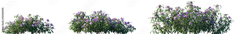 Set of Melastoma affine (blue tongue, straits rhododendron or native lassiandra) shrubs frontal isolated png on a transparent background perfectly cutout high resolution