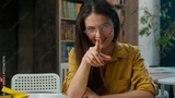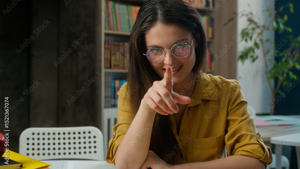 Caucasian girl smiling teen woman student high school pupil teacher learning write exam university college studying invite come here gesture invitation call motivate join to educational class lesson