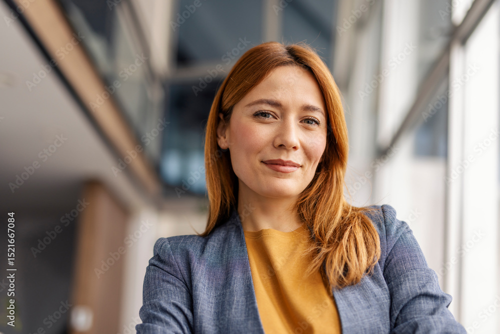 Portrait of smiling businesswoman standing at corporate firm and looking at camera.