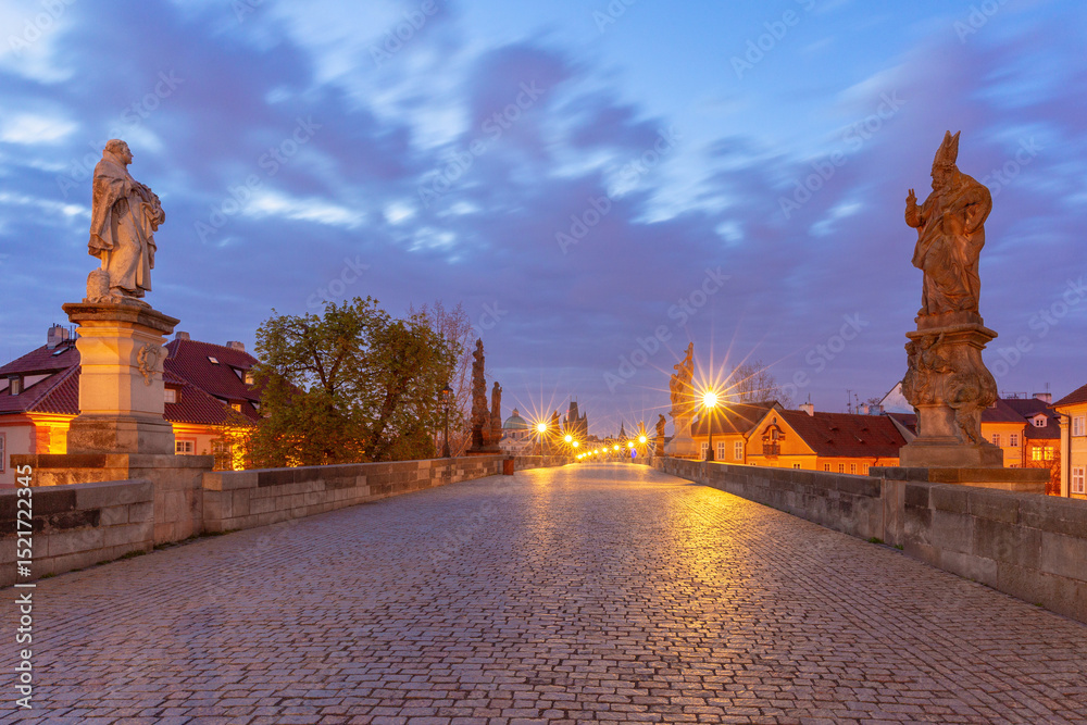 Charles Bridge with towers and sculptures at dawn in Prague, Czech Republic