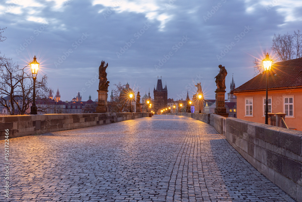 Charles Bridge with towers and sculptures at dawn in Prague, Czech Republic
