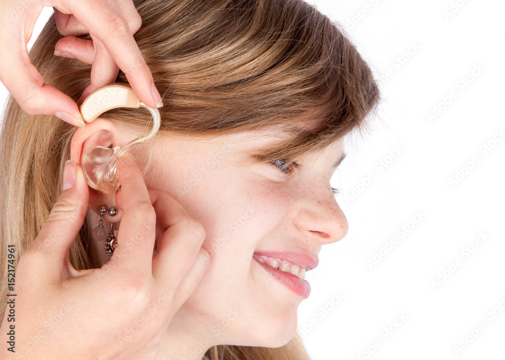 Close up of hands fitting a hearing aid to a happy young girl. Isolate on white.
