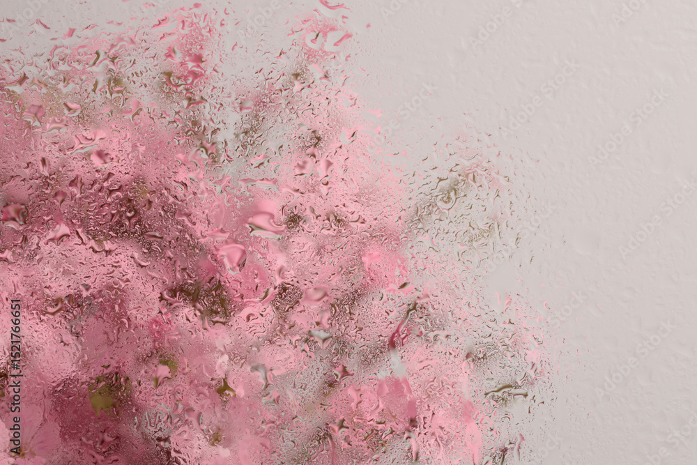 Smoke Selective soft focus pink Flower bouquet through glass with wet water drops. Abstract natural blur background.