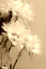 Smoke Selective soft focus Chamomile; aster; chrysanthemum Flower bouquet through glass with wet water drops. Abstract natural blur background.