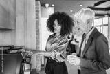 African american woman talk with colleague use modern coffee machine