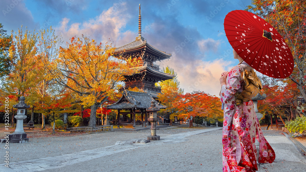 Japanese Woman in Traditional Kimono Dress at Shinnyodo or Shinshogokurakuji temple with beautiful autumn scenario in Kyoto, Japan