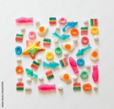 Vibrant assortment of colorful gummy candies arranged on a white background