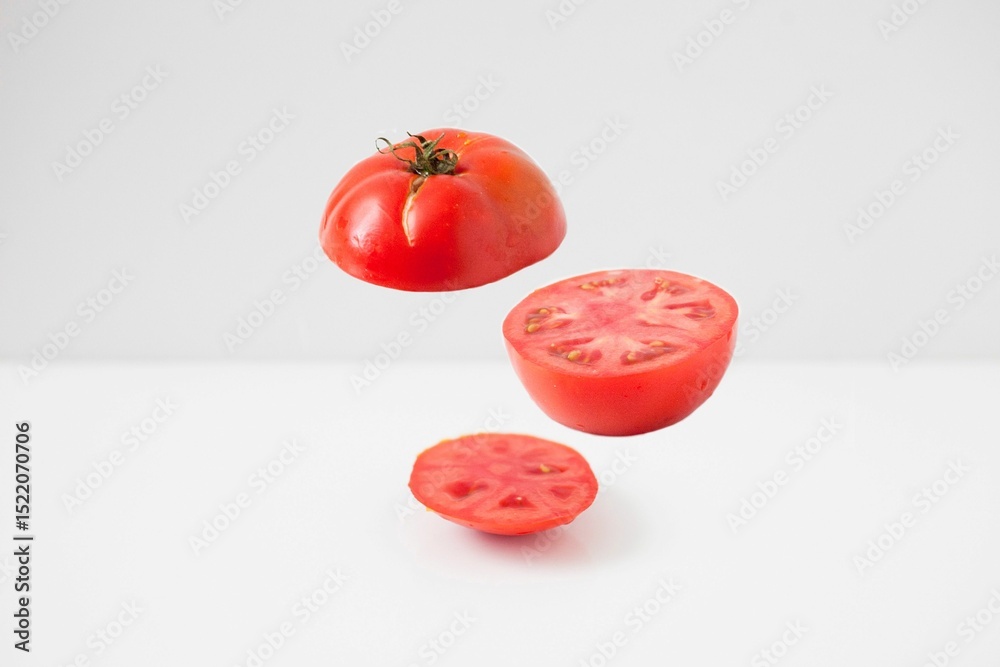 Floating tomato slices against a white background showcasing a creative food concept.