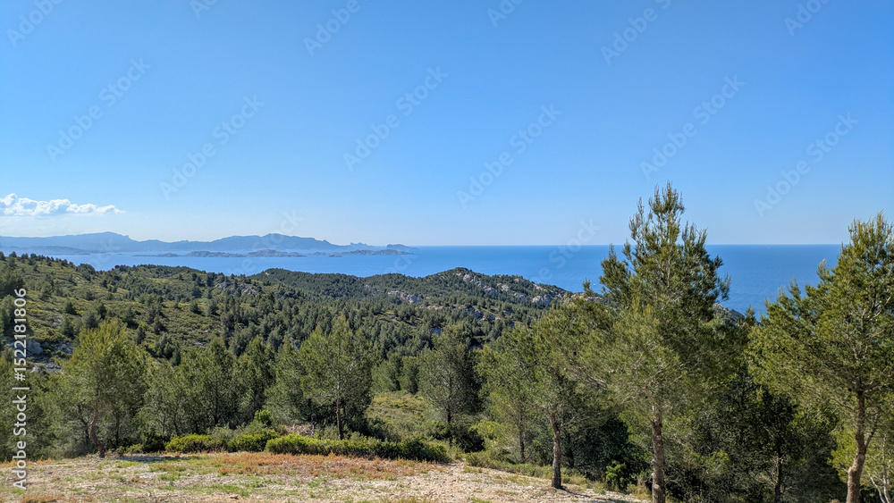 Open view of Mediterranean Sea and pine forest hills under clear blue sky, southern France landscape. Ensuès-la-Redonne, Ensues-la-Redonne, Bouches-du-Rhône, France, Provence
