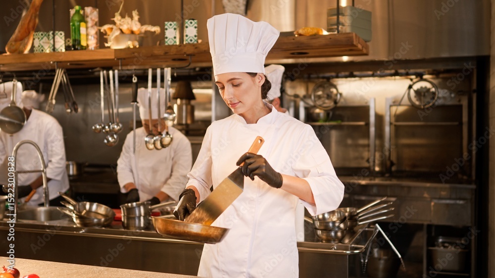 Portrait of focused beautiful female caucasian chef frying delicious food on pan and mixing. Attractive skillful cook in white uniform cooking tasty dishes at modern kitchen of fancy restaurant.