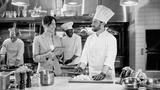 Portrait of attractive professional caucasian chef chopping vegetables and talking with beautiful cute female manager with tablet. Two colleagues discussing work at kitchen of restaurant.