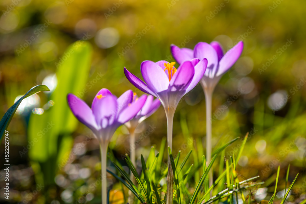 Three freshly bloomed purple crocuses in a meadow in March. Colorful, slightly translucent petals shine in low spring sun in a german garden. Macro shot with selective focus from frog perspective.