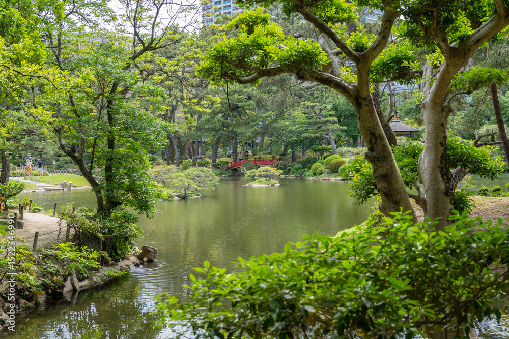 Traditional bridges in Shukkei-en Japanese garden in Hiroshima, Japan