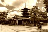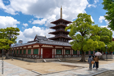 Women walking near pagoda at Shitenno-ji Temple in Osaka, Japan