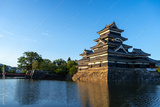 Matsumoto Castle reflecting in the water at sunset, Japan