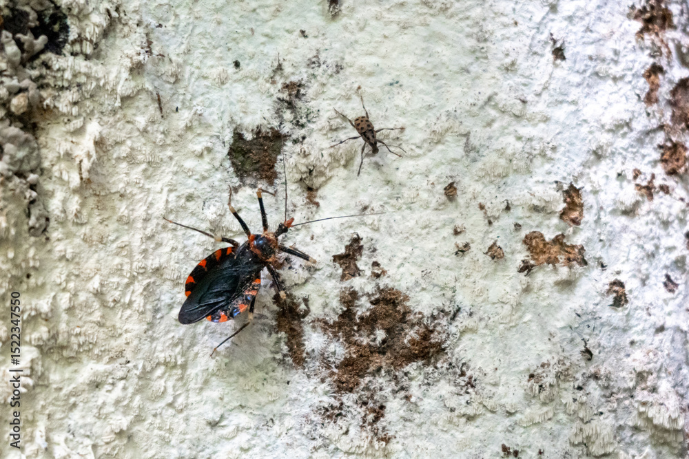Kissing bug on tree bark in Tentena rainforest, Sulawesi, Indonesia