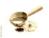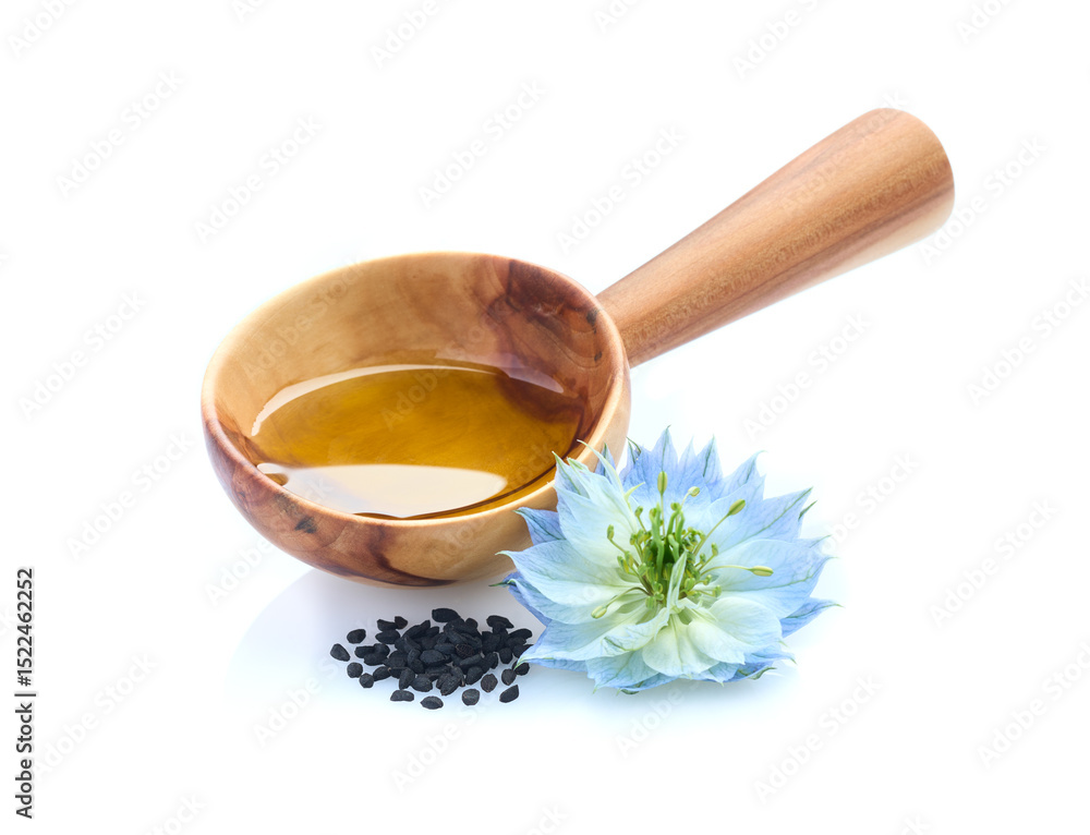 Black cumin seeds and oil with nigella sativa flower on white background