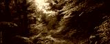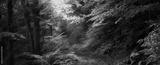 Panoramic woodland scenery with magical light. Dreamy painterly forest with softly illuminated tree branches shaping over a hiking path