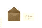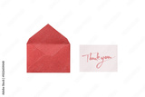 A cutout of a red lamé envelope with a pink handwritten thank you message card, overhead view