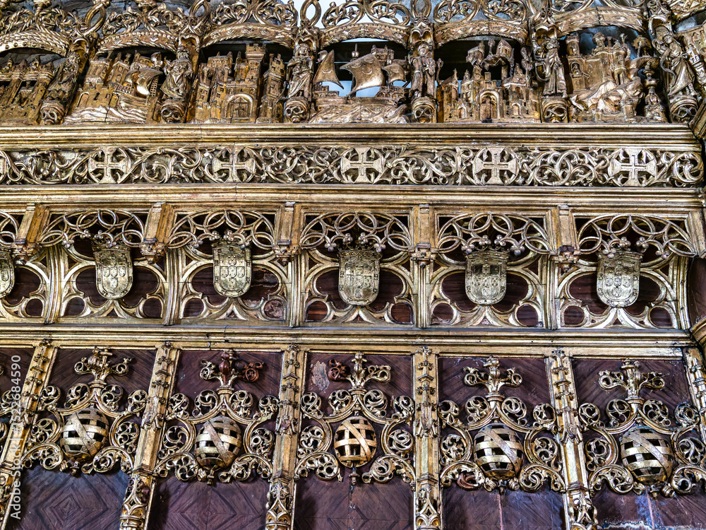 Gold gleeming Manueline choir stalls at Mosteiro de Santa Cruz monastery at Coimbra, Portugal