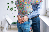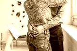 Closeup of couple at the white room. Man in a formal wear hugging by the waist a woman, wearing sexy jeans