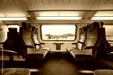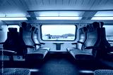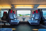 Blue empty opposing, first class seats in a moving train. Large window, daytime, summer, no people.