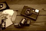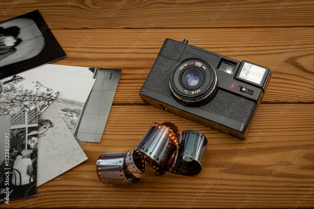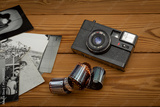 35mm film camera with film negative and black and white photos on wooden background. Old film camera, vintage analog in classic retro analog photography. Nostalgia concept