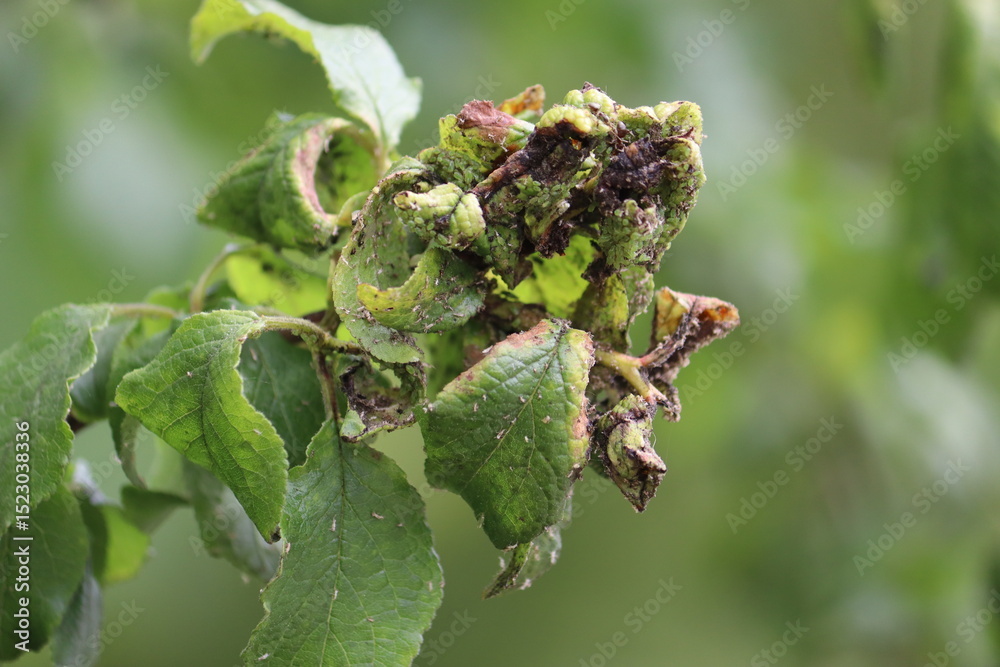 Aphids on curled plum leaves. Plum branch with green leaves damaged by garden pests